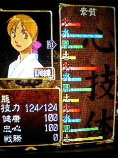 灯子の体で一番バーが長いのは水なんです。でも、生まれてきた子(汀子)は火肌。その交神のときには、体水と体火の数値が同じくらいだったので体火のほうが出たのかなと思ったのですが、今回、あきらかに体水の数値が高かったにもかかわらず子どもは火肌になったようでした。